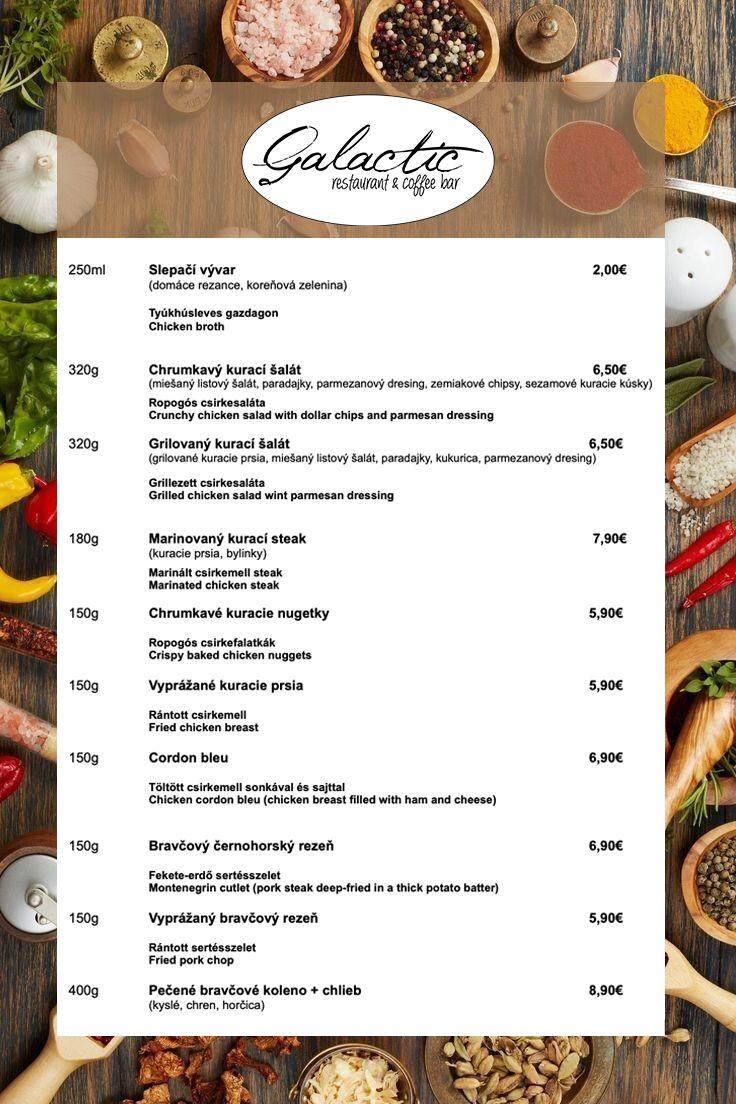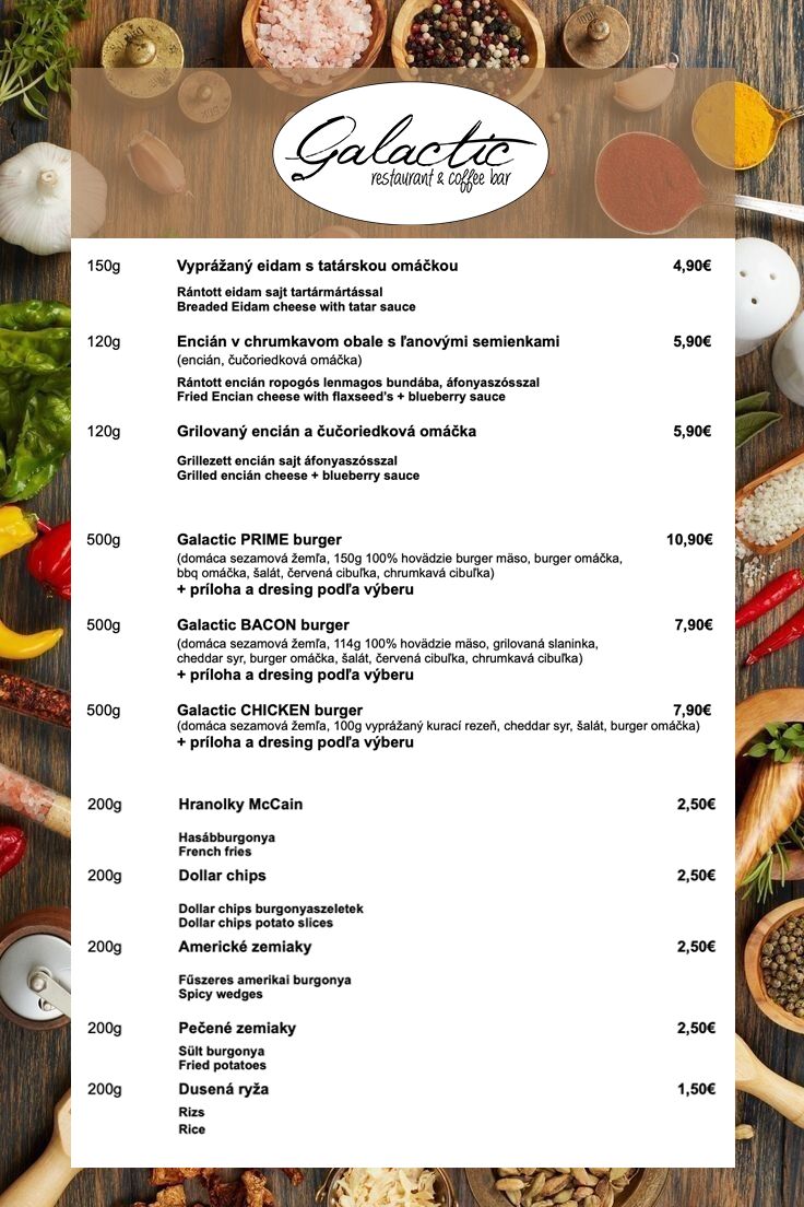 Prinášame Vám každý deň chutné menu, z ktorého si vyberie každý. Ponúkame Vám pizzu, gyros, burgre, jedlá z tradičnej slovenskej i maďarskej kuchyne.